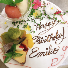 (サプライズの場合お席を立った時など、どのデザートをのせるかスタッフまでお伝えください。2~3名様の場合一皿に盛り込む方もいらっしゃいます(=お伝え不要)