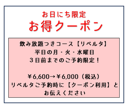 ※飲み放題をプラスできます(ジョルノ+飲み放題¥6500税込 テソロ+飲み放題¥9000税込)