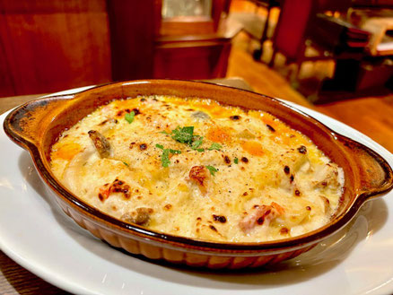 季節限定!こちらも始まりました!海老や帆立に自家製の優しいベシャメルソースがやみつきです・・・500℃の石窯で焼きあげるマルミッタならではのオリジナルグラタンです。